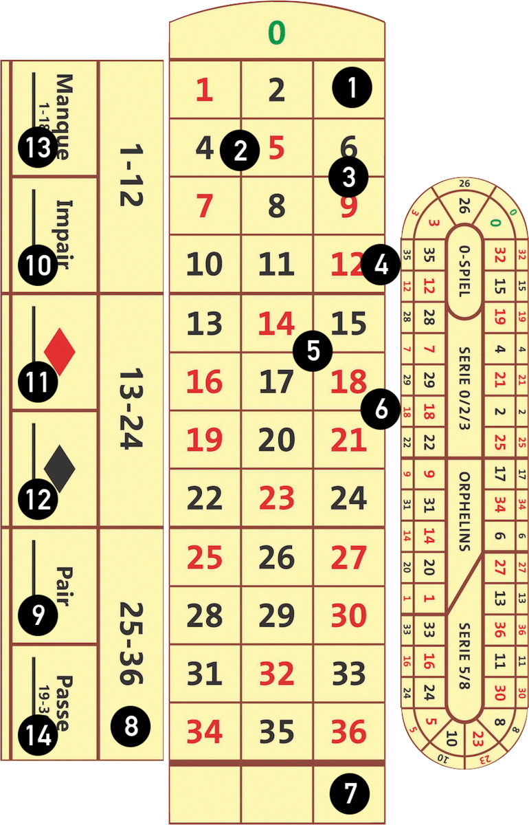 Auf dem Tableau sind die Zahlen numerisch angeordnet, umgeben von unterschiedlichen Setzfeldern. Die verschiedenen Gewinnchancen und Setzfelder werden in der Spielanleitung auf Seite 10 erläutert.