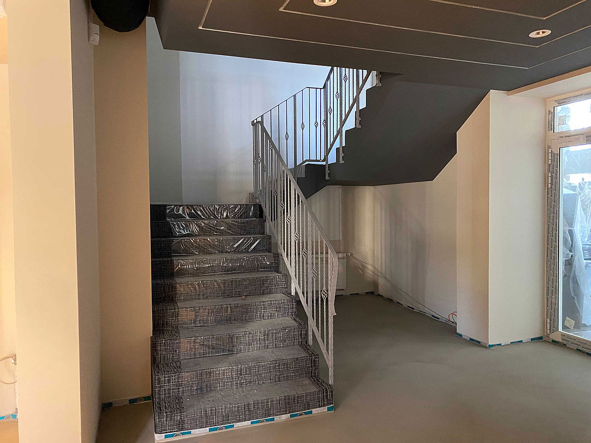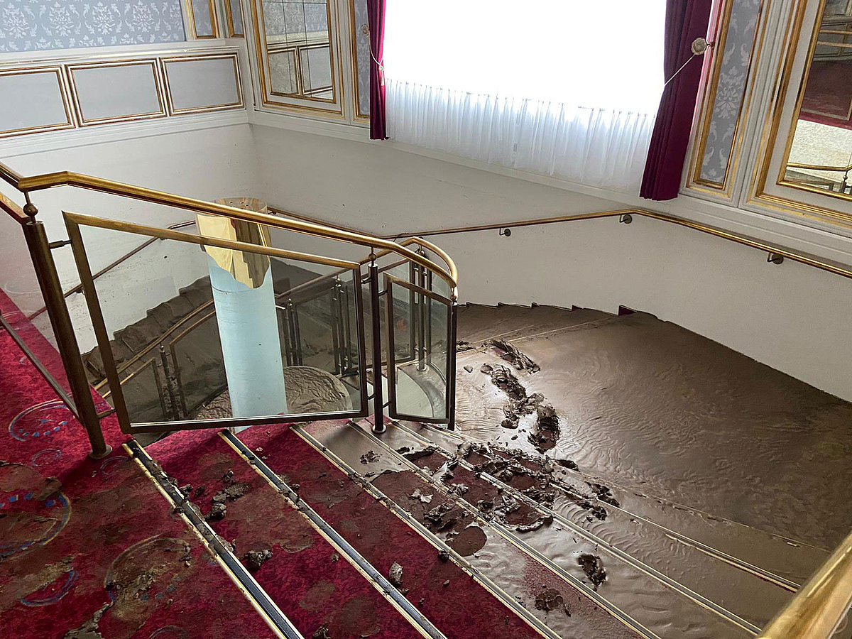 Treppenhaus mit Teppichboden voller Matsch und Wasser